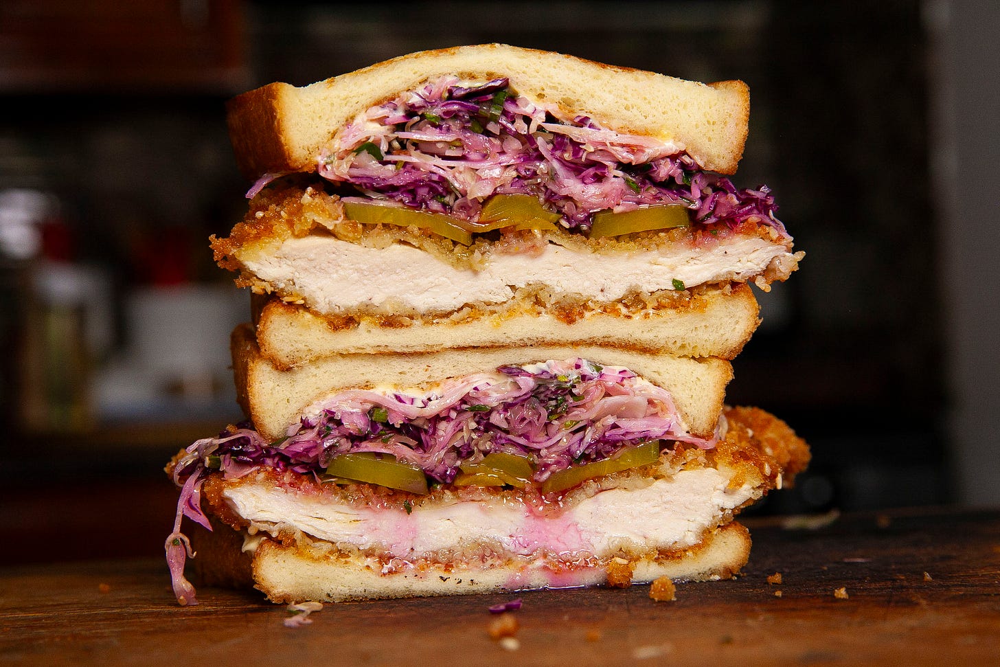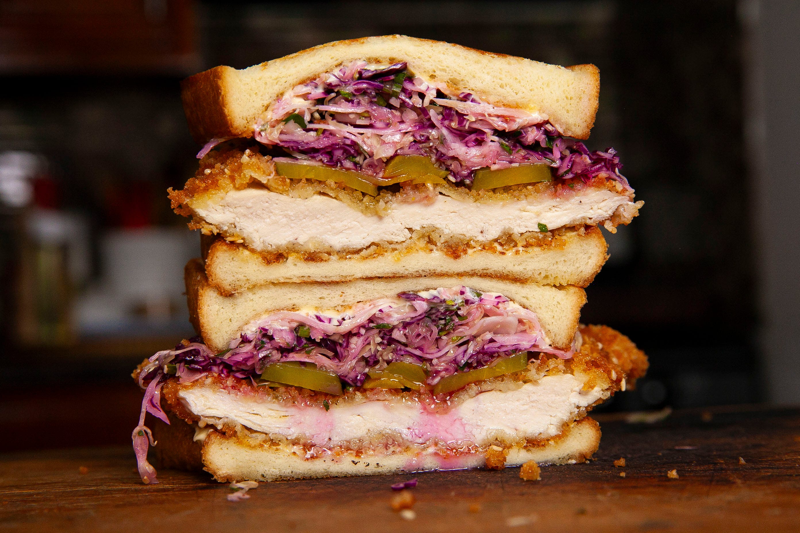 For my chicken cutlet sandwich, I use a mixture of red and green cabbage and toss it with olive oil, salt, pepper, and lemon juice (plus a little bit of scallion) and also add sliced pickles and mayonnaise. Japanese milk bread is so light and fluffy, so if I can get my hands on that, it’s what I use.