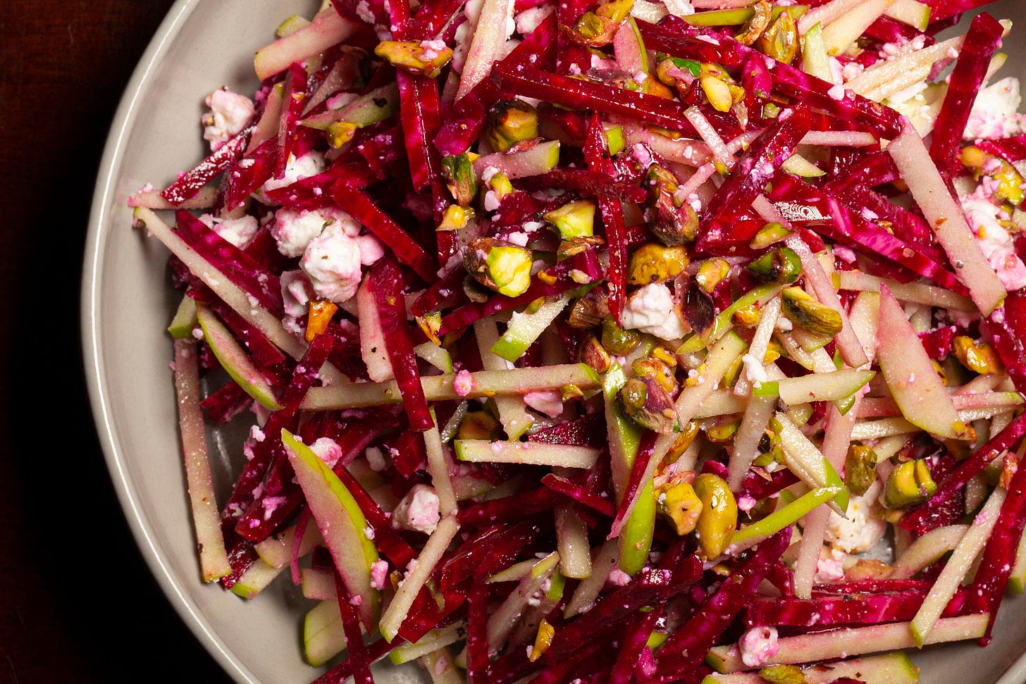 Crumbled feta and chopped pistachios get tossed with the beet and apple matchsticks, and the dressing is just a drizzle of olive oil and cider vinegar. It’s the perfect end-of-winter-patiently-waiting-for-spring salad.